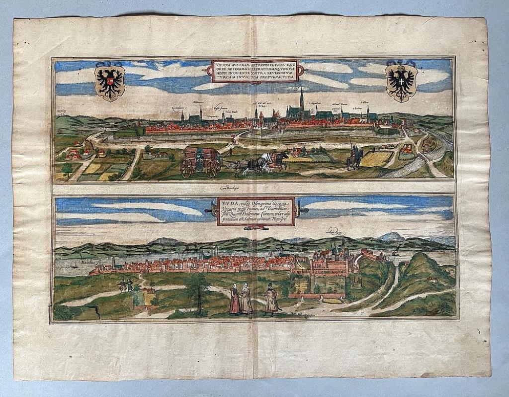 Dal “Civitates Orbis Terrarum”, 1580 circa, incisione in rame all'acquaforte, originale coloritura d’epoca, cm 42 x 54 (il foglio), testo latino al verso con la descrizione della città di Vienna. La raffigurazione comprende due vedute, in alto la citta… di Vienna, nella parte inferiore la città di Buda, in entrambe è ben visibile lo scorrere del Danubio. Un lieve ingiallimento ma ottima coloritura e ottimo stato.